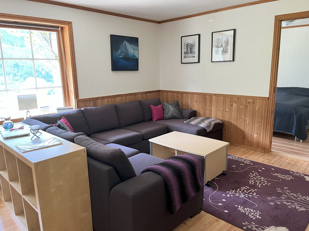 Apartamento no porão bem equipado de aproximadamente 60 m². No coração de Loen. O apartamento está sob a varanda, então a vista é reduzida. Sala de estar, cozinha, um quarto com cama de casal e banheiro. Entrada privativa e grande área externa/gramado com móveis de jardim. Internet e televisão por satélite. Carregador de carro elétrico por uma taxa
