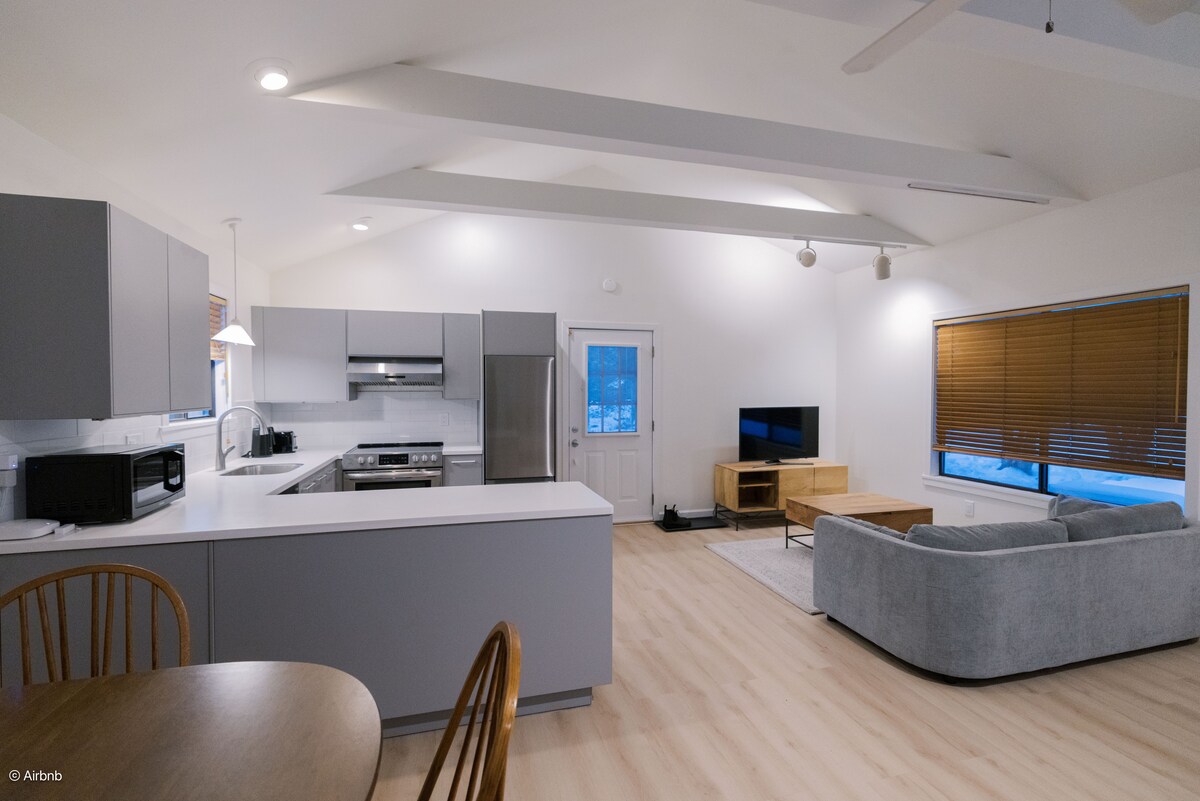 Aconchegante, vida simples, em casa de hóspedes separada com uso de comodidades (compartilhadas com nossa família de 4 pessoas), incluindo sauna e banheira de hidromassagem. O bangalô/pousada dispõe de uma cama queen size, seu próprio banheiro privativo (chuveiro), pequena cozinha (forno de bancada, cafeteira Keurig e pequena geladeira) e namoradeira para relaxar. Há uma área de estar externa separada dedicada para 2 hóspedes. 2 hóspedes adultos APENAS, sem crianças devido ao tamanho da casa de hóspedes e proximidade da piscina. Animais de estimação NÃO são permitidos, pois os proprietários têm animais de estimação