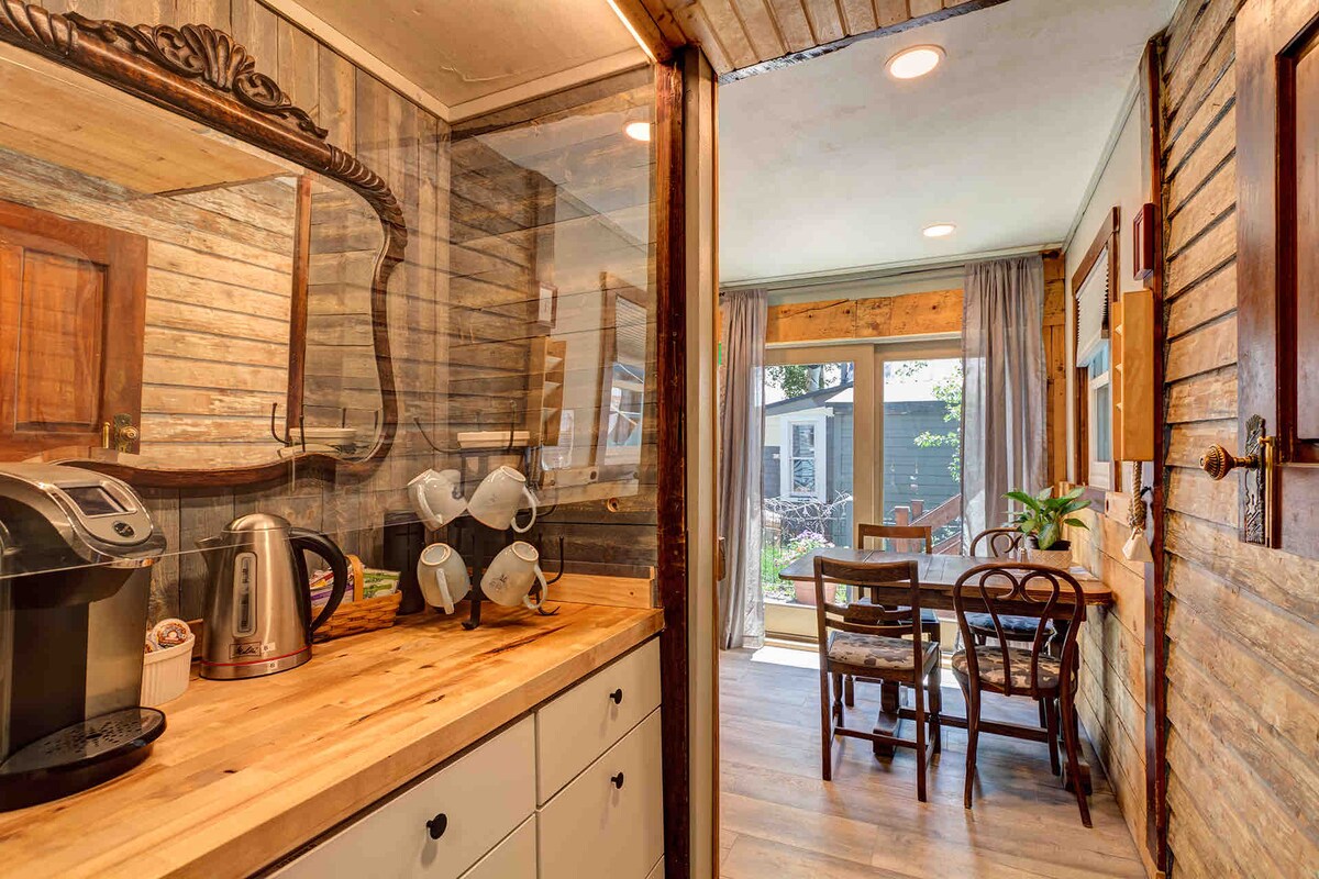 O quarto Sweethearts acomoda até dois hóspedes. Vouchers de café da manhã incluídos. Uma cama queen size, banheiro privativo com banheira de pés de garra vintage e chuveiro. Nova smart TV ROKU, frigobar, bar de café/chá atualizado e Wi-Fi. Relaxe na sala de estar no andar de baixo com lareira e saboreie seu café. Mergulhe à tarde na banheira de hidromassagem. Micro-ondas, forno de convecção, torradeira, talheres e utensílios de cozinha fornecidos em kitchenette disponíveis para todos os hóspedes.