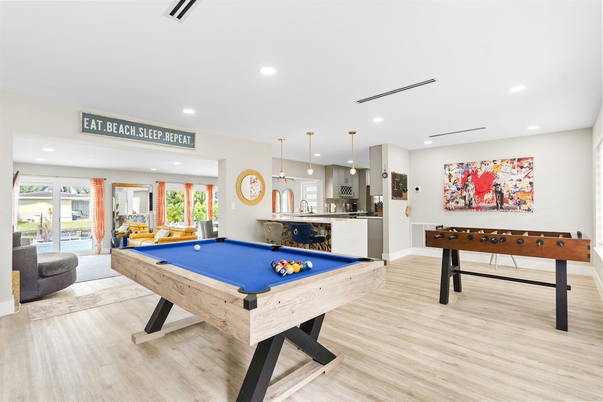 ⭐️RANKED TOP 10% OF HOMES ON AIRBNB 🌊Heated Salt Water Pool (85 degrees year round free of charge) 🌴2 bedrooms plus 3rd Game room with full size futon bed and lockable doors as a 3rd room 🚣Free Kayaks and Paddle boards right off the dock 🐠 70 ft Waterfront / FISH RIGHT OFF THE DOCK 🔥Tiki hut with fire pit & outdoor seating/ BBQ grill 🎯Gameroom 🏡 Fully remodeled home 📺TVs in each bedroom 🏝️Only 2.5 miles to beach! ⛱️Beach essentials included 🚘 4 parking spaces
