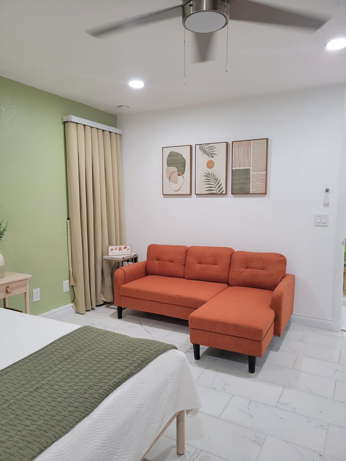 Estúdio luxuoso com entrada privativa, todo decorado em cores preto e branco, tem uma cozinha com todos os acessórios de cozinha, cama queen size, cama dobrável para outra pessoa adicional, TV, ar e aquecimento são individuais para o resto da casa, uma vez que o estúdio tem um mini split instalado, tem uma área para fumantes do lado de fora