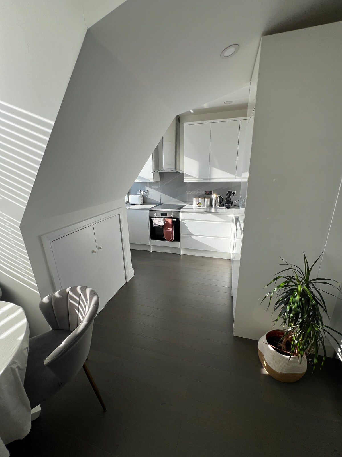 Apartamento moderno, aconchegante e elegante a poucos minutos da Surbiton High Street e da estação de trem - chegue ao centro de Londres em apenas 17 minutos. Aproveite o fácil acesso a Kingston-Upon-Thames com ônibus regulares. Rodeado por ótimos cafés, restaurantes e um supermercado a apenas 2 minutos a pé. O apartamento dispõe de um espaçoso corredor, generosa área de estar/jantar em plano aberto com cozinha, grande quarto de casal e banheiro de luxo. Há uma vaga de estacionamento designada no estacionamento privativo atrás do prédio para seu uso também