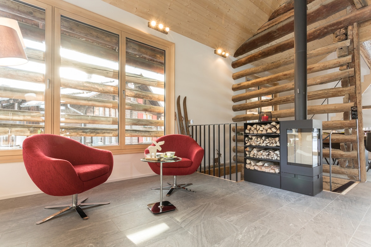 Relaxe neste Rifugio único. Apartamento de 2 1/2 quartos totalmente reformado em 2020, com design interior totalmente renovado. Construído como um loft com materiais nobres (granito Valser, piso em parquet, muita madeira antiga, banheira independente, lareira de ferro aberta em dois lados, acessórios de design). Com área de estar protegida no jardim e jardim. Localização ensolarada e tranquila. Entrada privada, sauna na casa ao lado. Esqui ou ônibus de esqui acessível em três minutos.