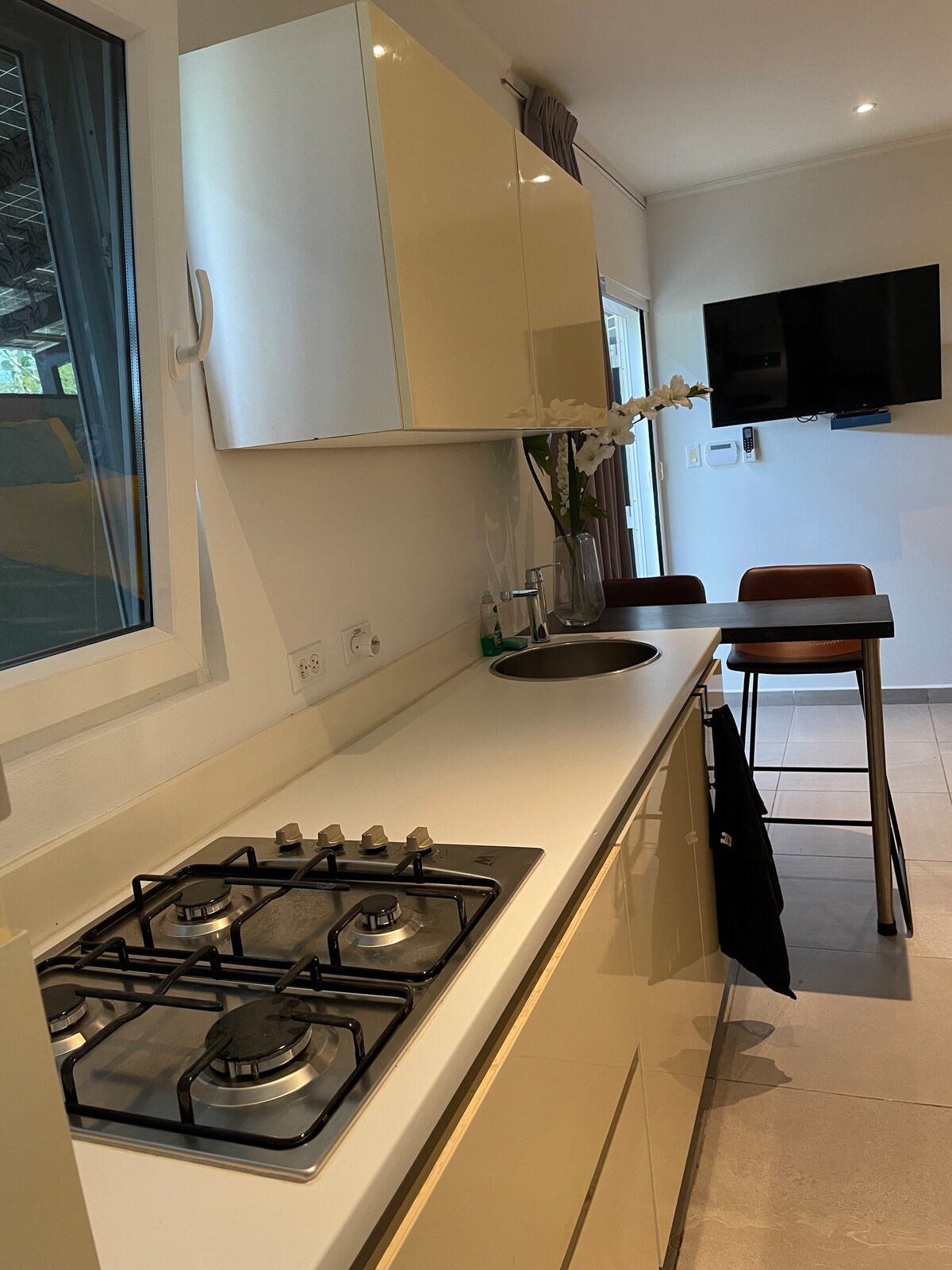 Apartamento novo. Com cozinha, geladeira e fogão. Bela área de relaxamento PRIVADA externa. Fica a poucos minutos de carro do centro da cidade, das praias e do nosso parque nacional. Você pode tomar um banho quente :D. Wi-Fi rápido e confiável! - Água quente no chuveiro - Estacionamento privativo (cercado) - Secador de cabelo - Cadeiras de praia que você pode levar para a praia - Especiarias estão no apartamento (caso você queira cozinhar :-) -Toalhas -Toalhas de praia - -Ferro e tábua de passar -Geladeira -SERVIÇO INCRÍVEL!!!