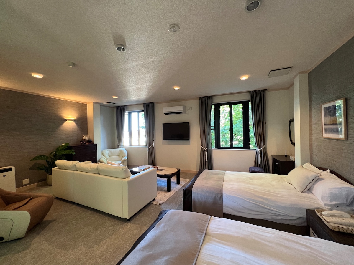 <Não fumantes> *Terraço privativo com banheira para os pés *2 camas e 1 sofá-cama *Banho em águas termais naturais *Estacionamento (1 vaga, 1º lote) *Carregamento de veículos elétricos (taxa) *Bebidas e doces de boas-vindas *Churrasco no terraço permitido *Proibido animais de estimação