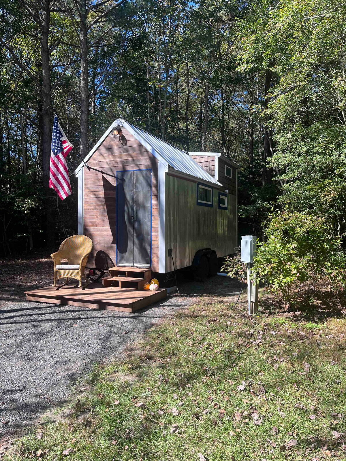 Tiny house in the woods, sounds of nature. Off grid w/ no wifi, yet close to dining, shopping & the beaches. We are also close to Delaware turf & sports at the beach, along w/ Dogfish Head Brewery. You'll wake up (& sometimes go to sleep) w/ the sounds of our rooster Bruce, & be greeted by a hen or our friendly cat Mittens. We do live on site and happy to answer any questions, point you in the right direction for dinner. Our sweat tent with wood stove now included for use while visiting.