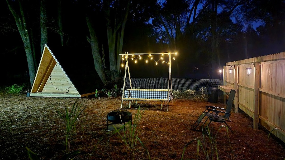Desconecte-se de tudo ao ficar sob as estrelas. Nossa Casa Hobbit com estrutura em A é acolhedora e seca e acomoda 2 pessoas. A casa tem eletricidade e ar condicionado nos meses de verão e aquecedor para os meses mais frios. Há uma casa de banho ao ar livre que é compartilhada com as outras pessoas na propriedade. Lá fora, há uma mesa de piquenique, cadeiras, grelha a gás com queimador e lareira. Fique à vontade para usar a lenha encontrada em nossa propriedade. Por favor, note que temos dois golden retrievers muito amigáveis e galinhas na propriedade.
