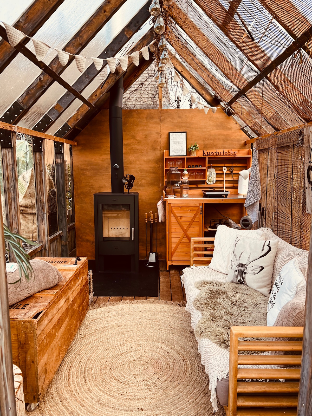 Nossa Bee House não deixa nada a desejar. Tem um novo banheiro com chuveiro/vaso sanitário e uma banheira independente, uma sala de estar com um fogão a lenha escandinavo, um frigobar, uma máquina Nespresso e uma galeria para dormir. É particularmente adequado para pessoas jovens que apreciam espaços calmos e a natureza. Se a subida até a galeria for muito difícil, há um sofá-cama confortável disponível no andar de baixo.