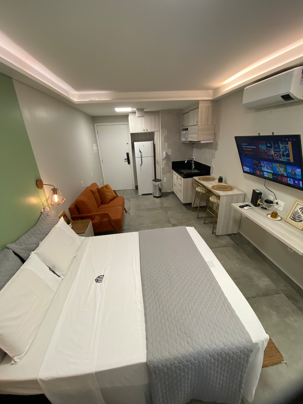 Estúdio em São Paulo, a 400m da Estação Alto da Boa Vista do Metrô (Linha 5/Lilás),Próximo ao Consulado Americano, Transamerica, Autódromo, Expo e Shopping Morumbi,ar condicionado e aquecedor.Está totalmente mobiliado e equipado sendo: Cozinha equipada com cafeteira, cooktop, geladeira, panelas e demais utensílios necessários ao preparo de meios rápidos, Smart TV, Wi-Fi, armário, mesa, roupas de cama e banho também estão incluídos, espaço de escritório.