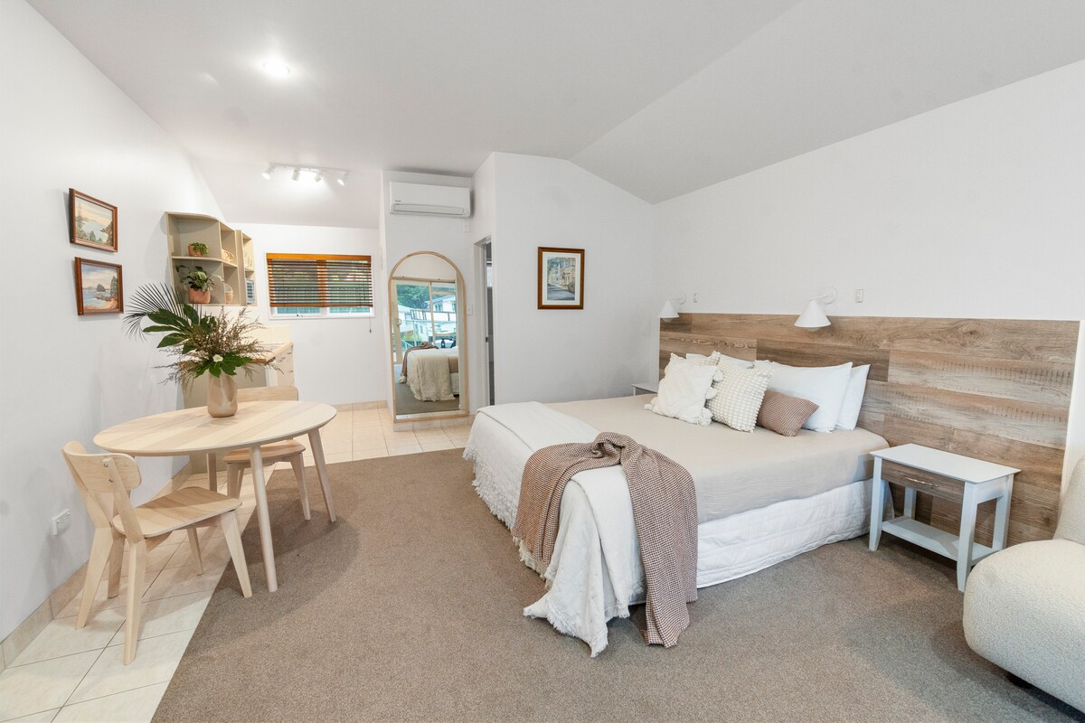 Quarto estúdio moderno com cama queen completa com pequena cozinha e uma suíte com penteadeira, chuveiro e vaso sanitário. É adequado para solteiros, casais ou viagens de negócios. Nós fornecemos um sofá, TV de tela plana de 50 polegadas com Freeview, Wi-Fi gratuito, estacionamento adjacente, mesa de computador e mesa de piquenique. Extensivamente renovado em 2019. Para os viajantes que querem cozinhar ou ficar mais de 1 noite, você pode pesquisar nosso outro anúncio "Um apartamento de férias com vista para o porto de Hokianga".
