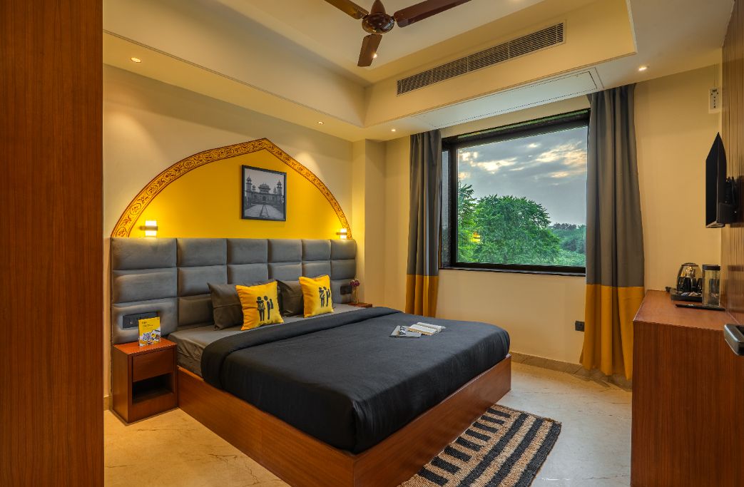 A bright and spacious King Room featuring a private balcony with peaceful garden views. The room is set inside a traditional Rajasthani-style heritage haveli, offering timeless charm and elegant interiors. Enjoy modern comforts throughout your stay, along with access to shared terrace and garden areas where guests can relax and unwind. Located just 10–15 minutes from the Taj Mahal, this room provides a calm and comfortable retreat that blends authentic architecture with warm hospitality.