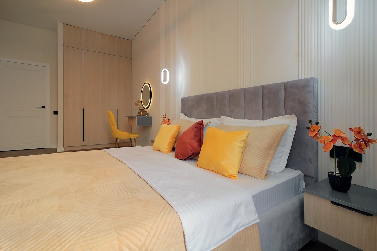 Дофаминовая квартира в центре города! Отличное место для комфортного проживания: • Просторная и светлая гостиная с высокими потолками. • Оборудованная кухня для тех, кто любит готовить. • Уютная спальня с шикарным видом на город. • В нескольких минутах пешком — магазины, кафе и рестораны, парки, пешеходные улицы. Мы создали это пространство, чтобы вы чувствовали себя как дома, а городской ритм был всегда рядом.