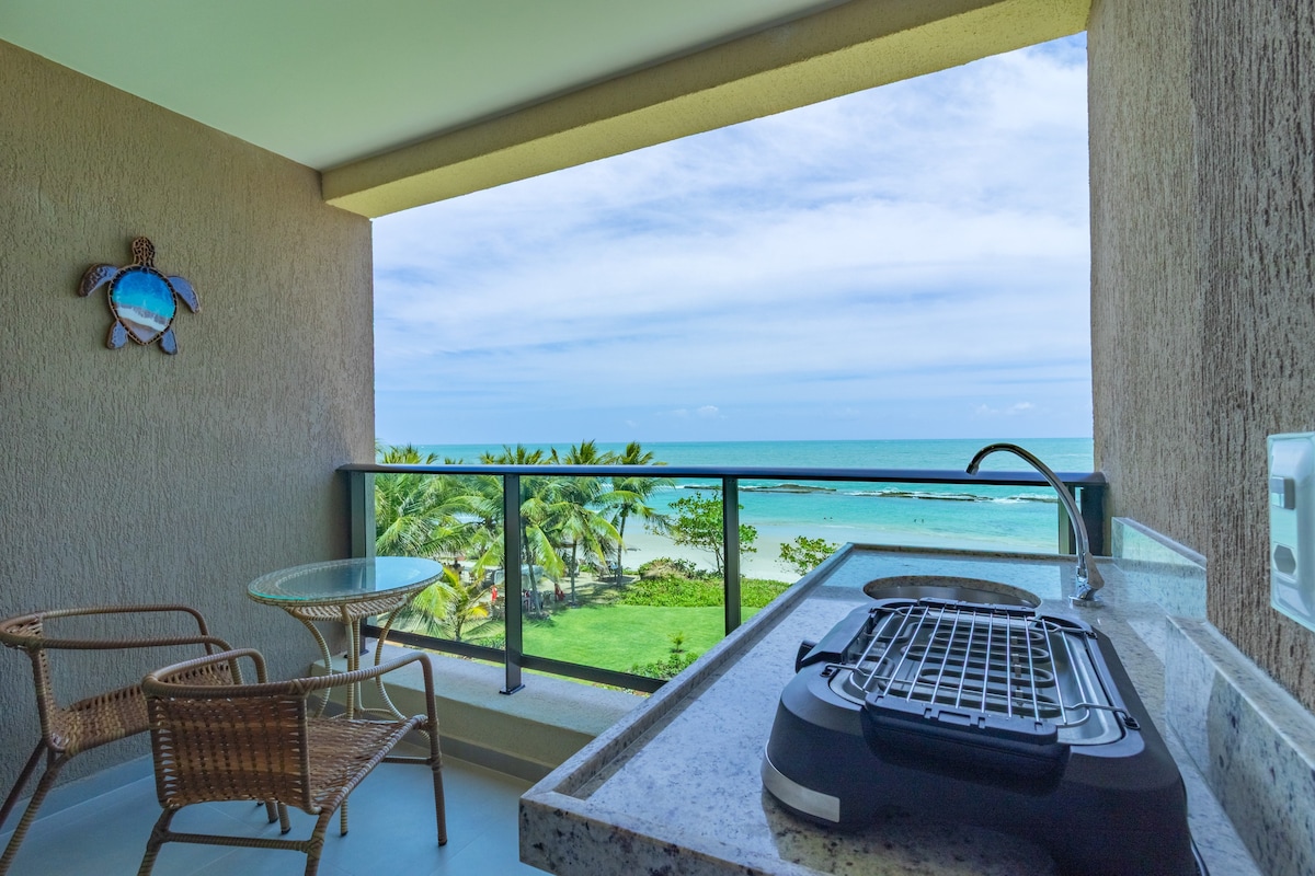 🌊🐚🐠Entre você e o mar, só a areia! Realmente pé na areia!🏖️ 🟦 PISCINA PRIVATIVA com vista para o mar! Acesso direto à praia. Varanda com mesa e churrasqueira, cozinha equipada, ar-condicionado, 2 camas (Queen Pillow Top & Casal EMMA) e chuveiro quente. Hospeda até 4 pessoas (mais 01 criança pequena com os pais). 🏡 Condomínio: Academia, espaço kids, rooftop panorâmico, piscina adulto/infantil e hidromassagem.