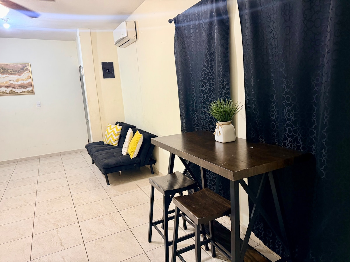 Departamento para descansar, con ubicación céntrica y económico. Cuenta con cama king y wi-fii, un abanico de piso, un closet, una plancha, baño completo, 1 cocina semintegrada con parrilla electrica, airfryer y un horno pequeño, utensilios de cocina y tarja de agua caliente y clima.