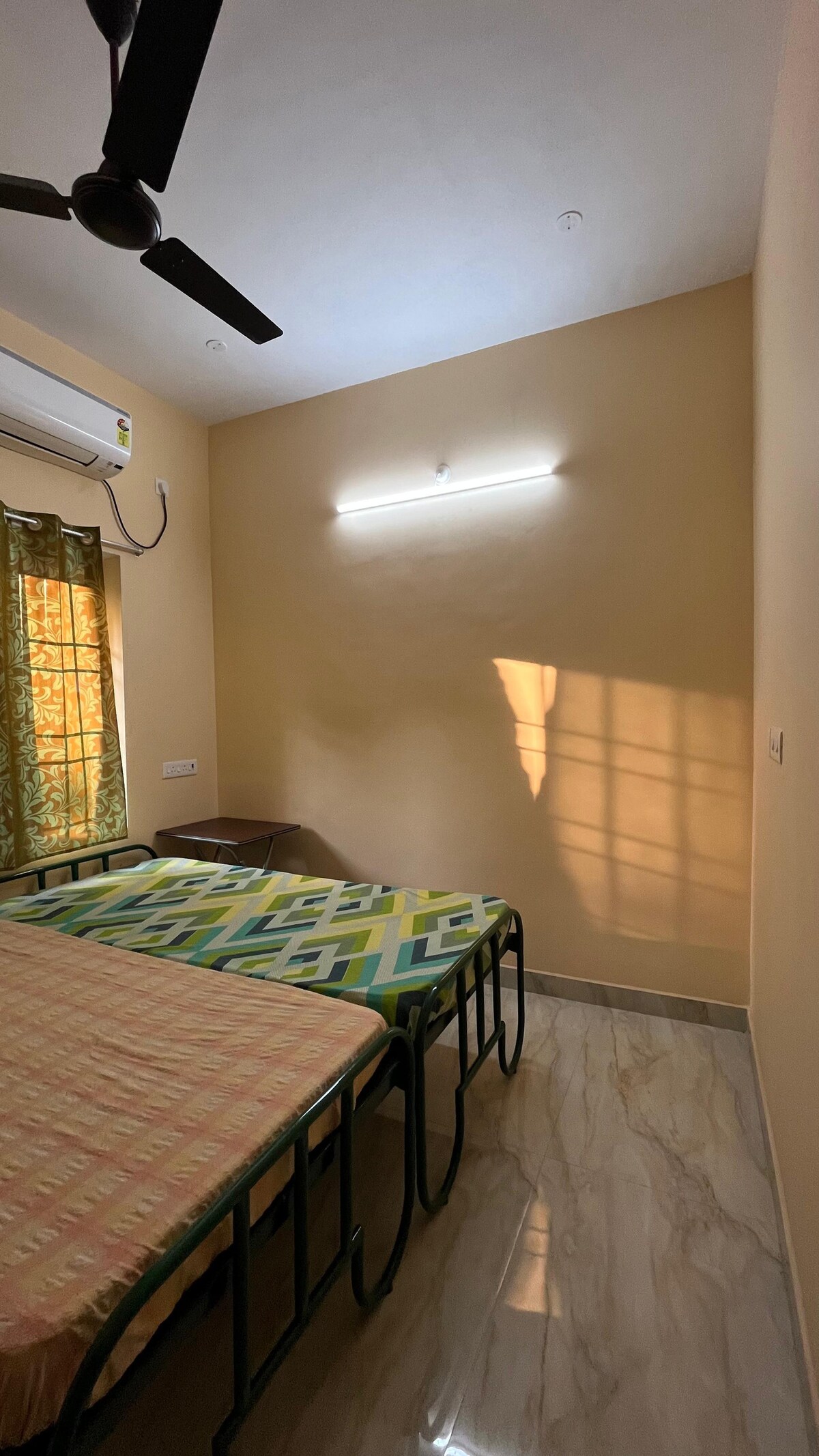 Um quarto tranquilo no terraço em meio à agitação da área de Bannerghatta. - Wi-Fi de alta velocidade - TV com conexão Jio - Ar condicionado 1,5 Ton - Sofá e cama confortáveis - Lanches de dar água na boca - Backup de energia da UPS A casa tem sala espaçosa e com uma cama confortável e banheiro anexo. A casa inteira tem ar condicionado. NOTA: O quarto fica no terceiro andar e não há ELEVADOR, apenas escadas estão disponíveis para chegar à nossa cobertura.