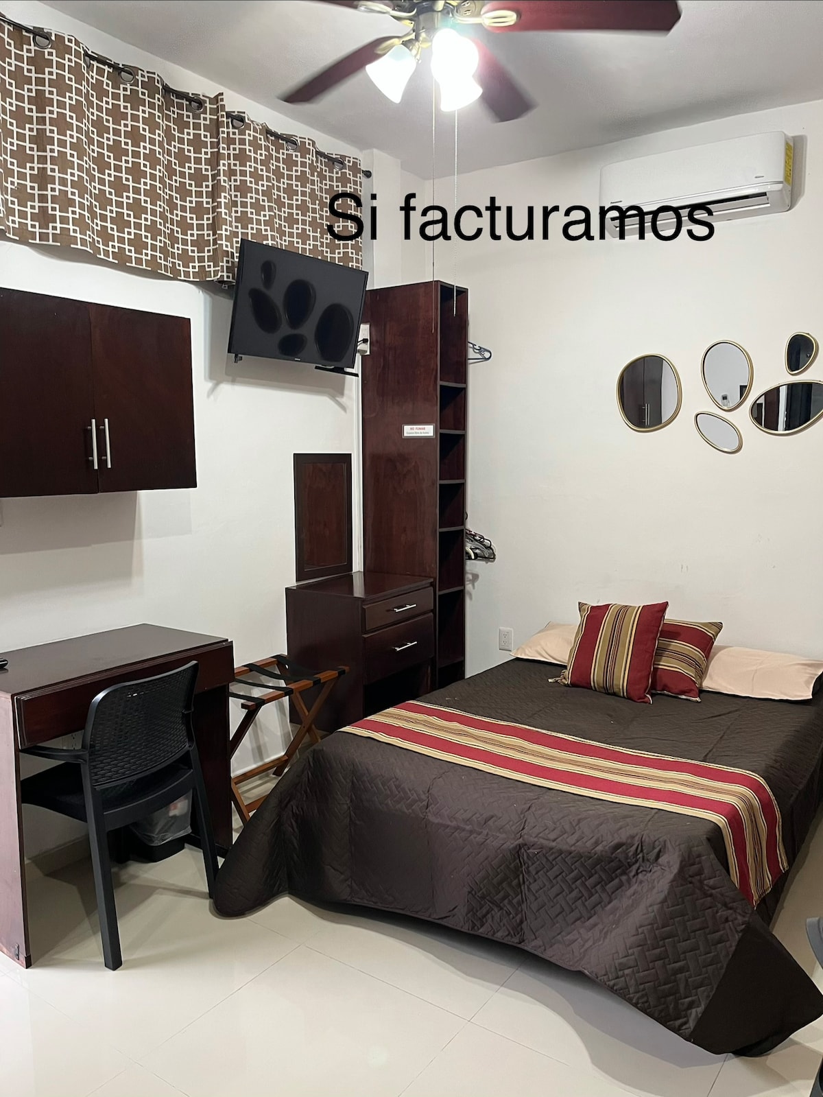 Mini apartamento confortável e moderno no térreo, localizado em um bairro residencial atrás da UAT, a 20 minutos da praia e do centro de entretenimento em Laguna del Carpintero. Tem uma cama de casal, área de trabalho com Wi-Fi, banheiro privativo, ar condicionado, cozinha com frigobar e forno de micro-ondas. Entrada privativa independente. As faturas são emitidas
