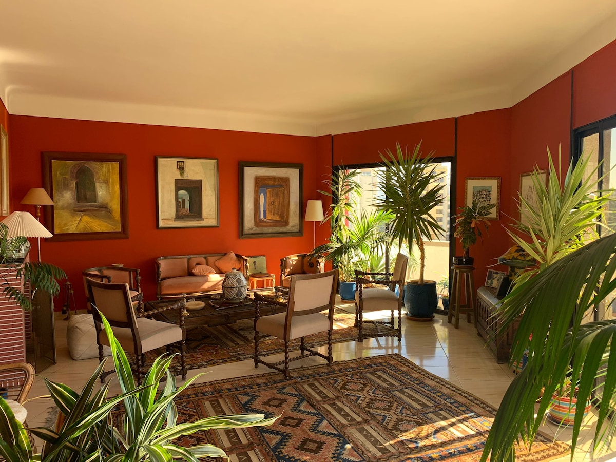 Bem-vindo ao nosso charmoso apartamento de 3 quartos situado no coração vibrante do centro de Tânger. Todas as comodidades necessárias estão disponíveis: Ar-condicionado, Smart Tv, Netflix, conexão de Internet de fibra óptica, máquina de café, toalhas, amenidades de chuveiro, etc. Localizado no último andar do edifício com acesso ao elevador, você está a apenas alguns degraus de distância para acessar o incrível terraço e admirar vistas deslumbrantes de Tânger, Espanha, o estreito de Gibraltar e as montanhas de Chefchaouen.