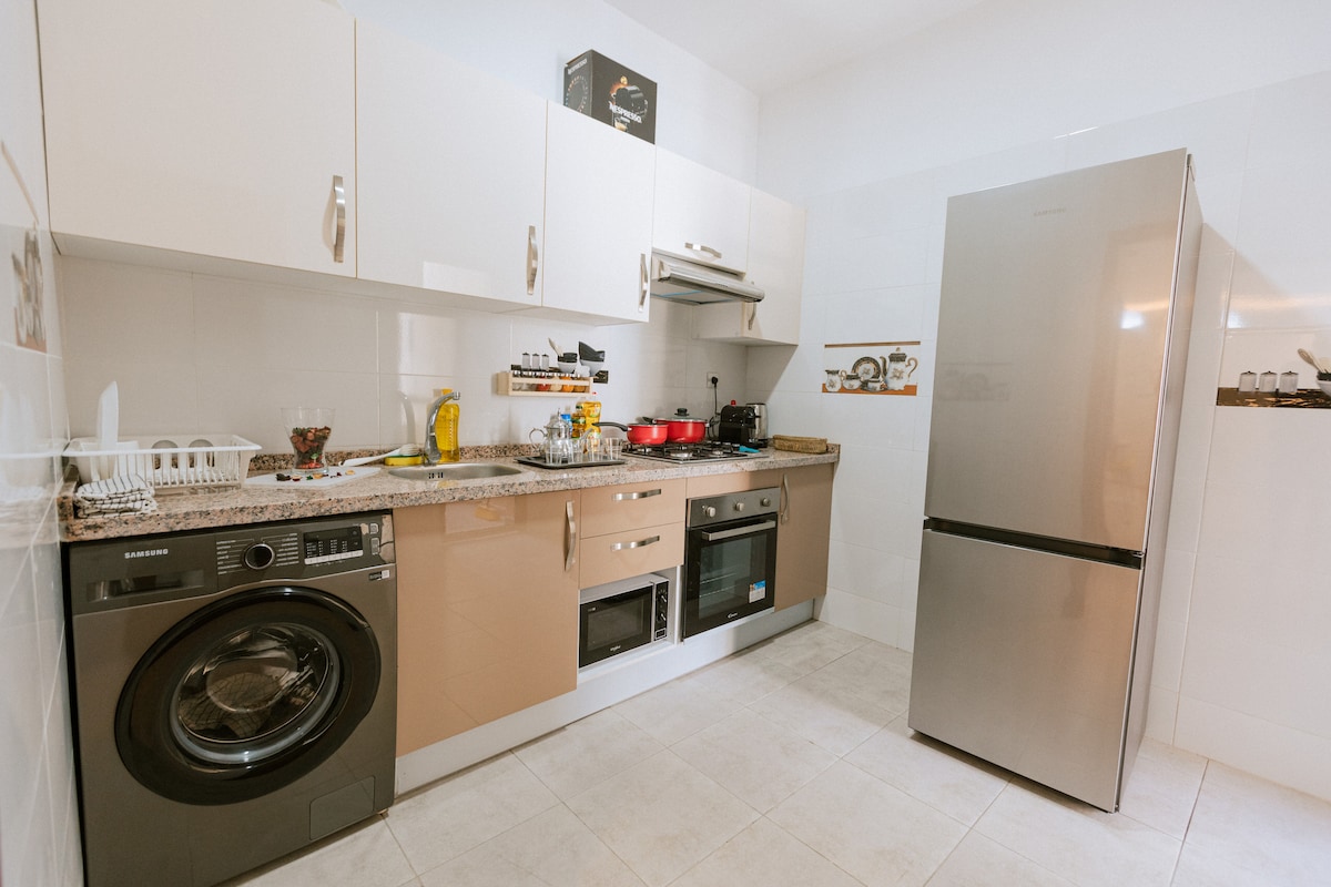 Ashraf Home offers an exceptional luxury stay in a modern and refined apartment within secure residence with a private ParkinG. Appart Recently renovated and tastefully furnished, it delivers premium comfort, Wi-Fi🛜,Ideally located, close to Beach shops and coffees, 8 minutes from the Airport, 2 min from the Grand Stadium, 5 min from Achakar Beach🌊and 11 min from the city center. new furniture, two spacious living rooms, a fully equipped kitchen, Bathroom and two elegant bedrooms, Book now☺️🎉