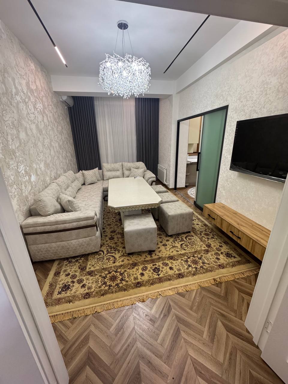 Reserve por mais de 3 dias e ganhe um transporte gratuito de ida e volta para o apartamento! Vida de luxo na Infinity Residence no coração de Tashkent! Este apartamento elegante apresenta acabamentos elegantes e design moderno. Localizado em um complexo de elite com áreas verdes ao ar livre, parque infantil e segurança 24 horas. Rodeado por cafés, restaurantes e boutiques da moda à sua porta — perfeito para viagens de negócios e lazer.