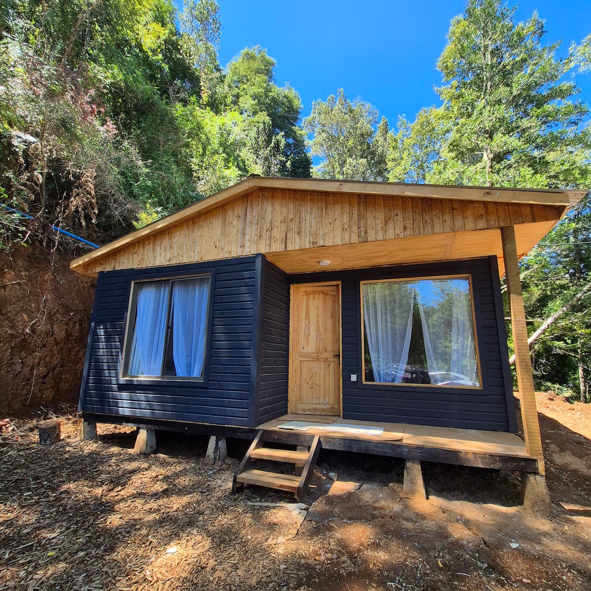 Pequena cabana cercada por árvores frutíferas e natureza muito acolhedora, o quarto de casal fica em um sótão, um sofá-cama no primeiro andar, com terraço, piscina, estacionamento e pequena churrasqueira, ideal para um casal sozinho, com um filho ou acompanhante. Temos lavanderia, o custo por 10 kgs. é de $ 5.000.- inclui secagem. O aquecimento é apenas para o inverno. Alugamos caiaque para 2 pessoas e canoa canadense
