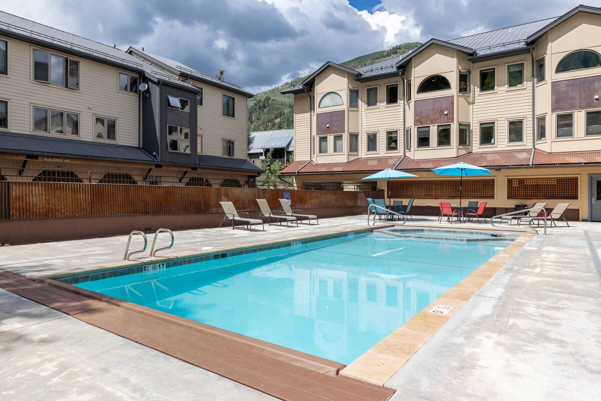 Este lindo loft fica a uma curta distância a pé do elevador 7 e dos melhores restaurantes de Telluride. Desfrute de vistas desobstruídas das janelas maciças ou da varanda privativa e sombreada. Relaxe ao lado do riacho na piscina ou na banheira de hidromassagem. Esta unidade é um condomínio privativo no último andar no melhor bairro de Telluride. Reserve rapidamente, pois isso não estará disponível por muito tempo. Número da licença: 021554. BL #611