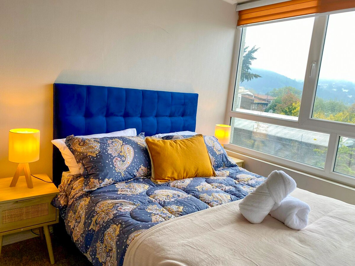 Apartamento acolhedor de 2 quartos para até 4 pessoas, idealmente localizado no centro de Temuco, com fácil acesso à Avenida Alemania e à Plaza de Armas. Desfrute de uma sala de estar fresca e iluminada, camas confortáveis e uma cozinha equipada, perfeita para o seu descanso. Um grande valor agregado é o estacionamento privativo e coberto gratuito (2 metros de altura). É a base perfeita para explorar a cidade, fazer check-in para negócios ou planejar suas viagens pela região.