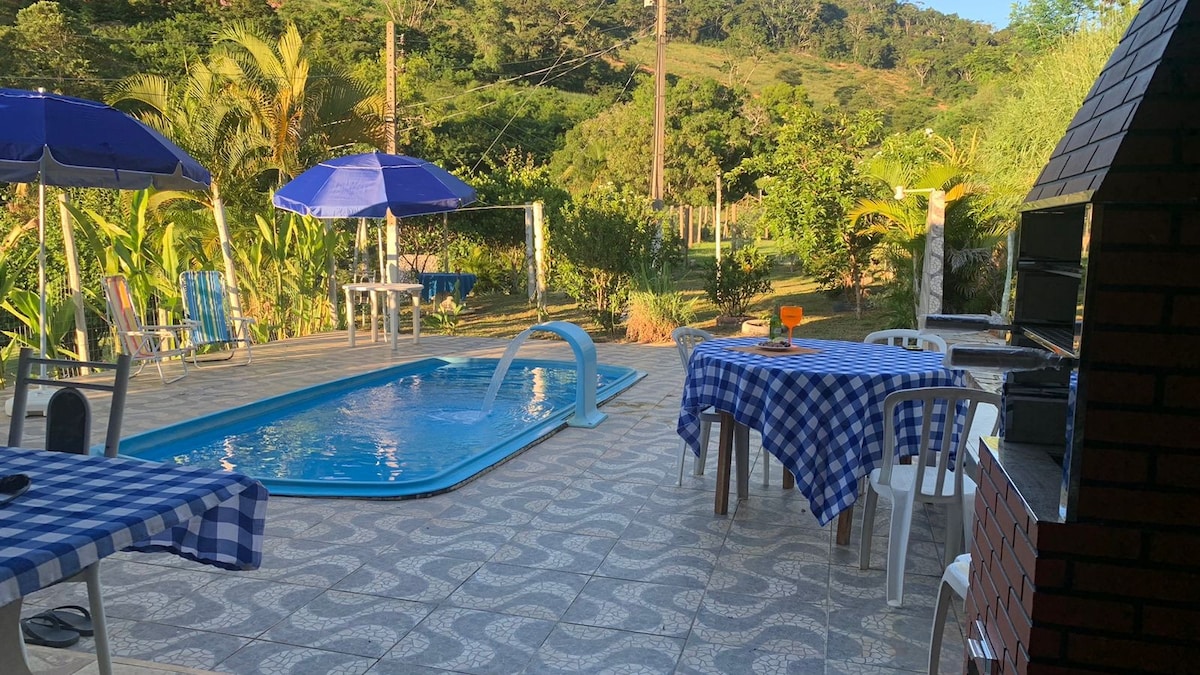 Casa 4 qts, 3 banheiros, churrasqueira, sinuca, piscina, sauna, ducha externa, campo de futebol, parque infantil com pula-pula, confortável, arejada, churrasqueira, estacionamento, jardim, lagoa, cavalos, bike, ...