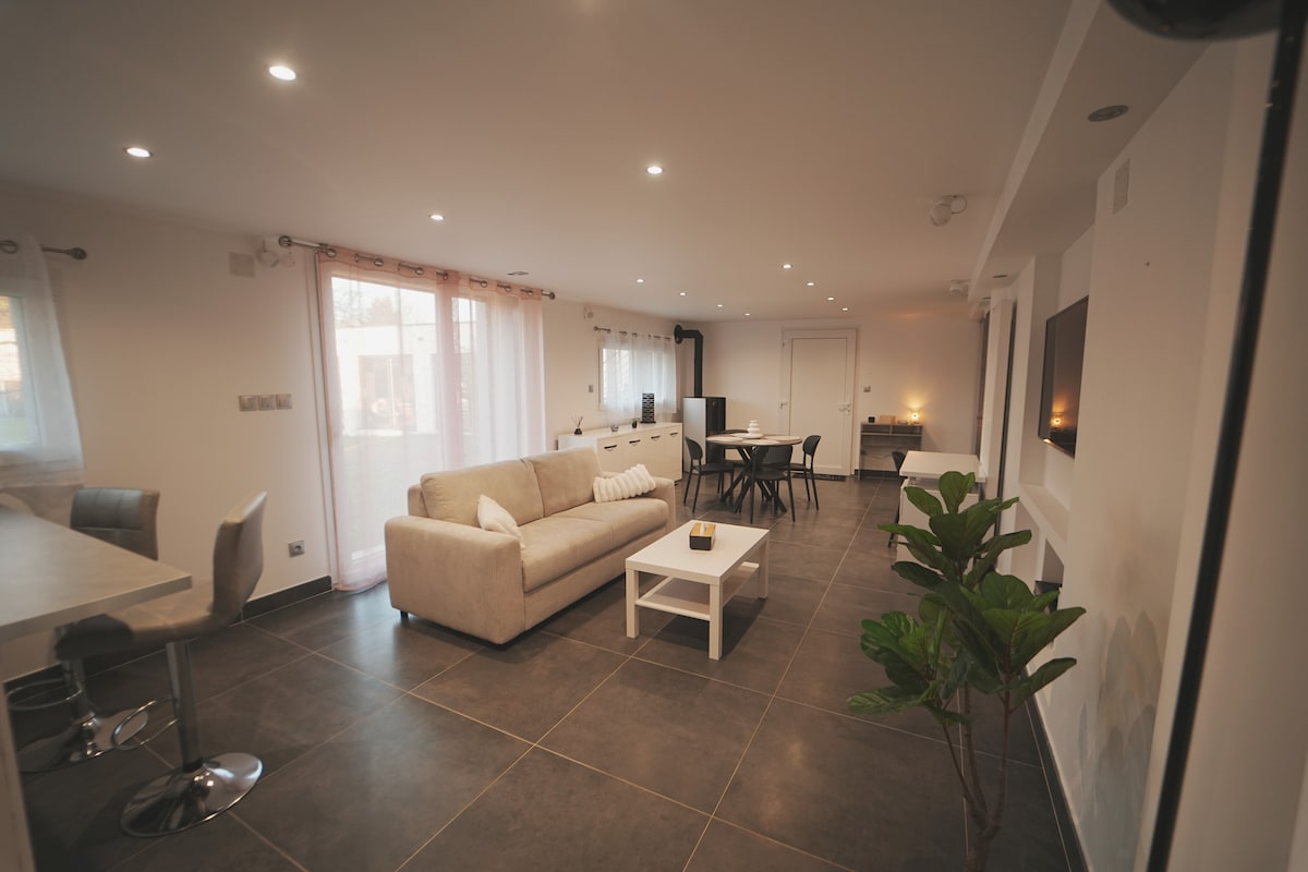 O L'instant Bulles oferece uma acomodação de 100 m² totalmente renovada. Este alojamento tem 1 cama em um quarto separado / 2 sofás-cama e 1 cama em um quarto aberto. Este alojamento inclui uma sala de estar elegante e perfeita para grupos. É também composto por uma cozinha aberta para a sala de jantar e sala de estar para maior convivência. Para relaxar, uma sauna (dentro da acomodação) e um spa (fora, mas coberto) estão à sua disposição.