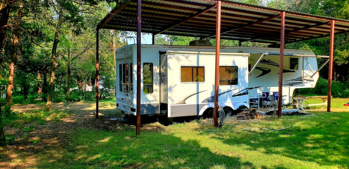 Desfrute de uma estadia tranquila enquanto brinca no Lago Texoma! Este pequeno trailer está situado em uma área tranquila com uma praia a apenas 1/2 milha de distância. Acomoda quatro pessoas confortavelmente com uma cama “rv queen” e dois beliches “rv twin”. Você ficará confortável com ar condicionado, um toldo extensível para sombra e área de estar ao ar livre com uma mesa, fogueira e churrasqueira. Wi-Fi rápido! O bairro tem uma rampa de barco e uma praia com grande área de lazer coberta de grama. Jantar e uma marina a 1 milha de distância. Entrega do Walmart.