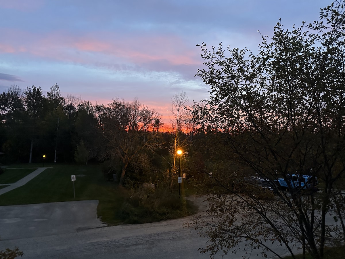 Unidade de estúdio recém-renovada no Mountainside North Creek Resort com: * Cama king * SMART TV, WI-FI Rogers Ignite de alta velocidade e TV * Sofá duplo * Banheiro remodelado *Cozinha equipada com Keurig * Decoração moderna e elegante *Serviço de traslado * Banheira de hidromassagem durante todo o ano *Piscina (programada para abrir de sexta-feira, 8 de maio de 2026, a terça-feira, 13 de outubro de 2026)* *Quadras de tênis *Esqui ou caminhada de entrada/saída para a colina norte (trilhas para caminhada, esqui diurno intermediário-avançado)!
