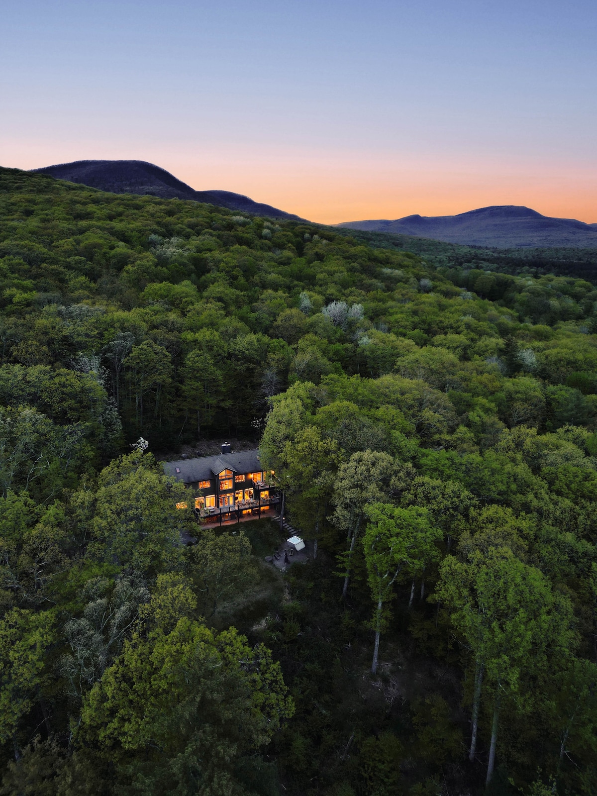 Spacious, peaceful lux cabin atop the Catskills. Enjoy mountain views, make smores, & soak in the hot tub. Catch up in the vaulted room by the fireplace w/ our wide game selection, while others watch movies downstairs. Host a dinner party with our fully equipped kitchen. Centrally located, 20 mins to 6 towns. Visit breweries, antique shops, dine, hike, fish, golf, or relax. Fast 600mbps internet. Perfect for groups, families, kids & pets. WFH, newborn, pet friendly. 3+ nights get discounted rate
