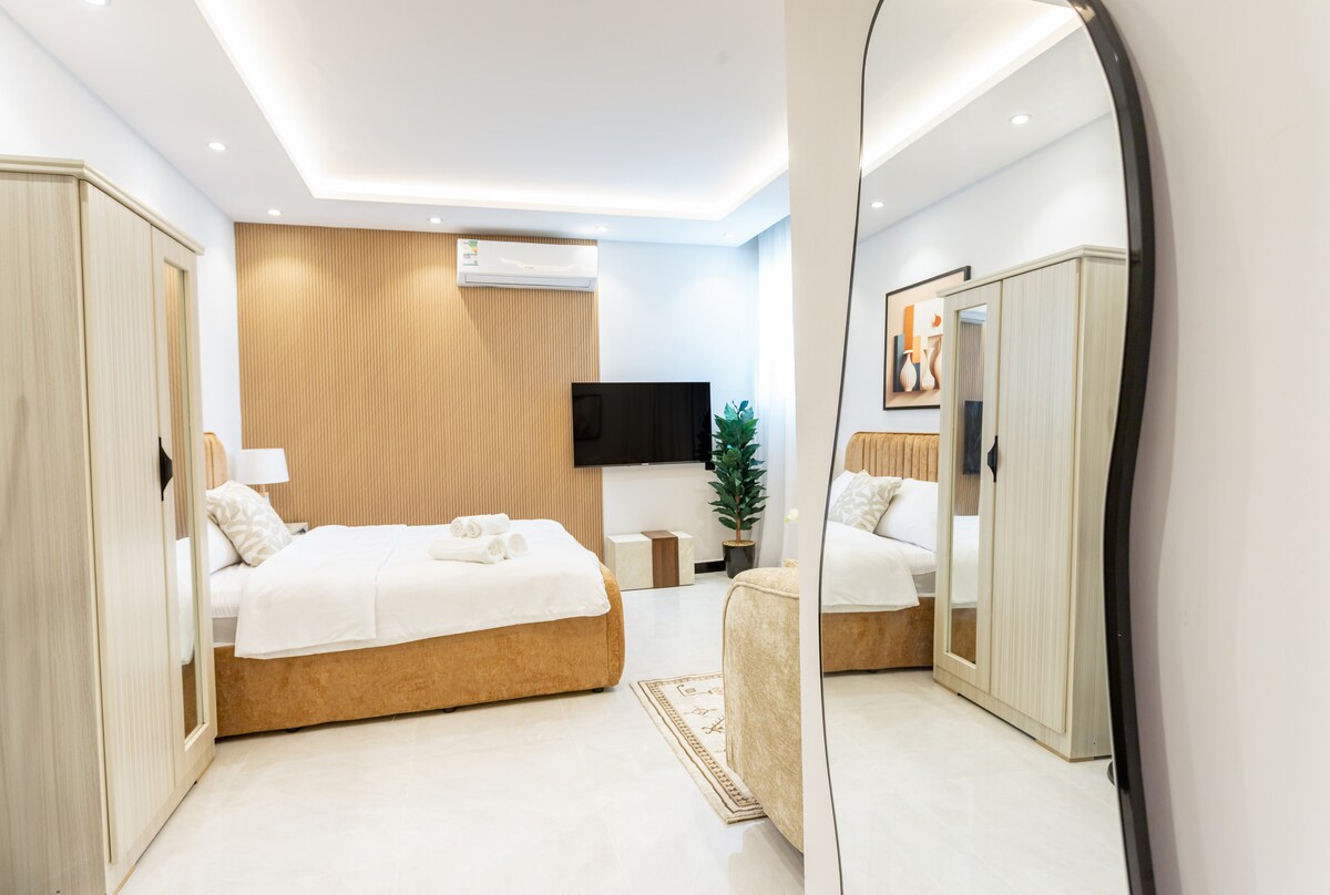 • 📺 برنامج ترفيهي فاخر يشمل جميع القنوات الرياضية والعالمية • 🎬 منصة أفلام ومسلسلات متنوعة بجودة عالية • 🌐 واي فاي فائق السرعة • 📺 شاشة ذكية 65 بوصة لتجربة مشاهدة سينمائية • 🛏️ غرفة نوم فاخرة بتصميم راقٍ • 🛌 سرير إضافي عند الطلب برسوم • ✨ ديكور عصري بلمسات فندقية راقية • 🍽️ مطعم متوفر في نفس البناية • ☕ كوفيات جميلة جدًا بالقرب من الموقع • 📍 موقع استراتيجي مميز يسهل الوصول إليه • 🕊️ خصوصية وهدوء تام