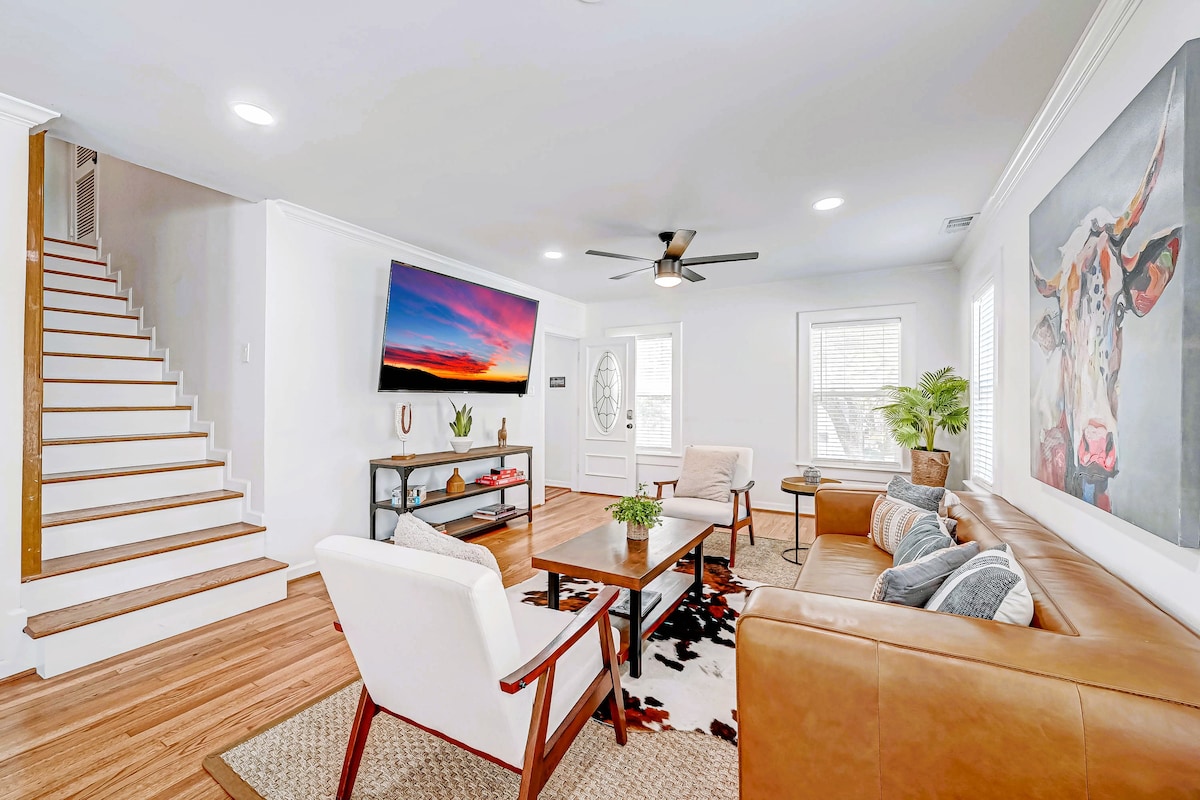 Welcome to your Montrose retreat! This cozy 2BR/1BA bottom unit features a king & queen bed, free parking, and speedy WiFi. Relax in the living room with two couches, a TV, and a dedicated workspace. Cook in the fully equipped kitchen or unwind on the private patio. Located in the heart of Houston, you're minutes from top restaurants, bars, museums, and stadiums. Whether you're here to explore or unwind, you'll love the bright, inviting atmosphere!
