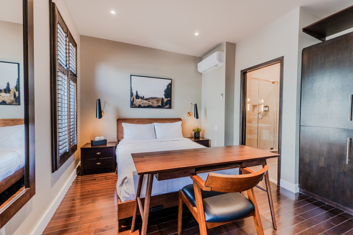 Este elegante quarto de hotel combina estilo e conforto, com uma cama king size macia e lençóis premium. Localizado em um dos bairros mais vibrantes de Montreal, você está a poucos passos de cafés, bares e joias culturais. Os hóspedes também têm acesso a um acolhedor lounge no saguão e a um espaçoso porão com assentos aconchegantes, uma mesa de bilhar e TV de tela grande — perfeita para trabalho ou relaxamento.