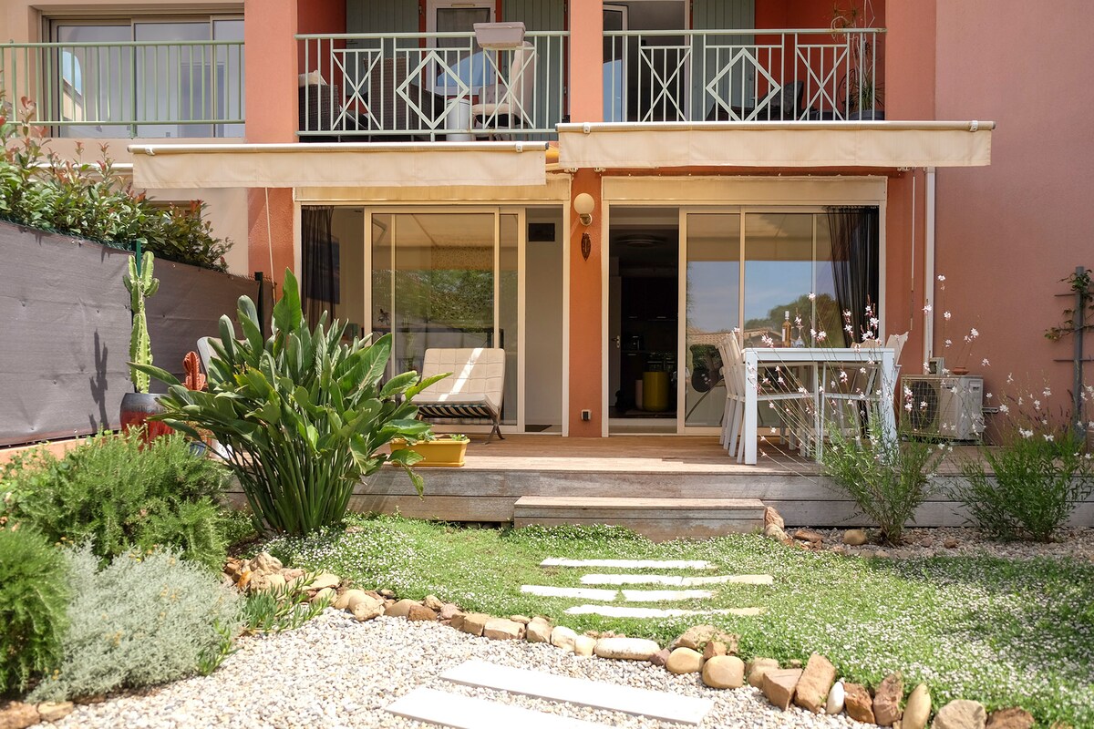 Acomodação classificada 1 * 5 min das praias de carro 2 quartos Piso de jardim entre o mar e a montanha absolutamente calma. Acomoda 4 pessoas, quarto separado e sofá-cama. Acesso direto à Piscina com vista para o mar, acesso direto às Montanhas Esterel. Terraço decorado e jardim privado. Você terá um espaço de estacionamento seguro. Todos os confortos Roupa de cama de qualidade, Wi-Fi rápido, TV de tela plana, ar-condicionado, máquina de lavar roupa, secadora de toalhas, geladeira com congelador pequeno. Roupas de cama e toalhas fornecidas.