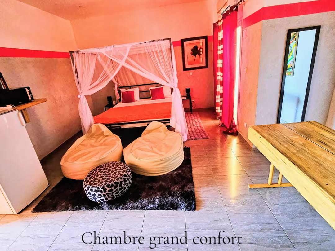 VIP ROOM : Chambre spacieuse, de type roof top avec vue panoramique, ouverte sur terrasse et piscine avec baies vitrées, proposant un lit King size de 1.80m 3 places, un salon en cuir, un écran plat de 65 pouces câblé avec IPTV, wifi avec fibre. Salle de bains avec jacuzzi 2 places, une douche séparée, eau chaude, climatisation, réfrigérateur, Four micro ondes, bouilloire. Eau chaude, électricité, climatisation, wifi fibre, TV avec IPTV, accès piscine.