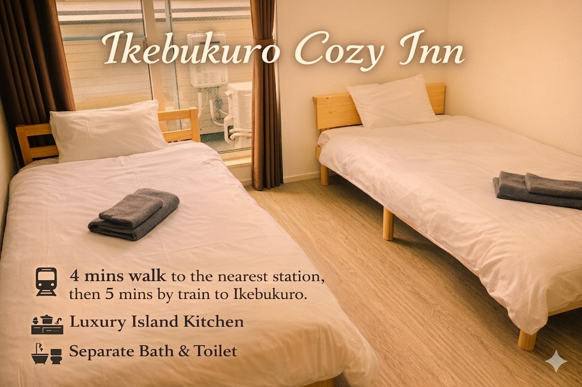 Kulkuri Tokyo 101 Pule as escadas! Nossa rara casa de 516 pés quadrados no 1º andar é perfeita para grupos, famílias e bagagens pesadas. Vida espaçosa a apenas 10 minutos de Ikebukuro! 【O Espaço】 • 516 pés quadrados 2 quartos • Confortável para até 4 hóspedes 【Roupa de cama】 • BR1: 1 cama queen size (160 cm) • BR2: 2 camas semi-duplas (120 cm) Perfeito para uma boa noite de sono após passeios turísticos. 【Acesso】 • 5 minutos a pé da estação • 10 min para Ikebukuro (direto) • 25-30 min para Shinjuku/Shibuya 【Área】 Tranquilo e seguro com lojas de conveniência 24h e restaurantes nas proximidades.