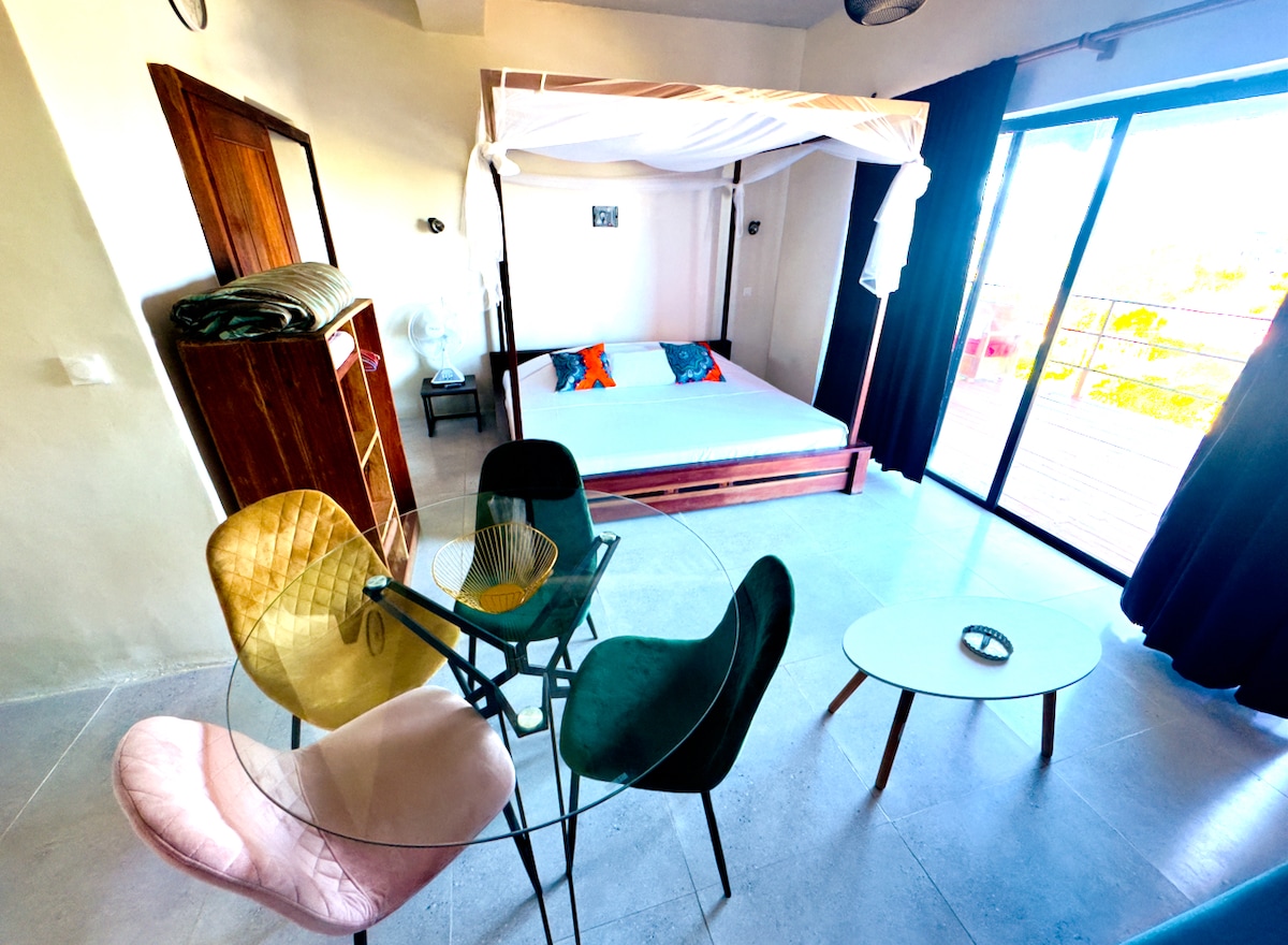 Desfrute de um cenário elegante e refinado para uma estadia inesquecível em Tulear. Esta suíte exclusiva oferece todos os confortos que você merece: área de estar, ar-condicionado, TV, Wi-Fi, banheiro com banheira de hidromassagem privativa e um grande terraço para momentos de relaxamento absoluto.