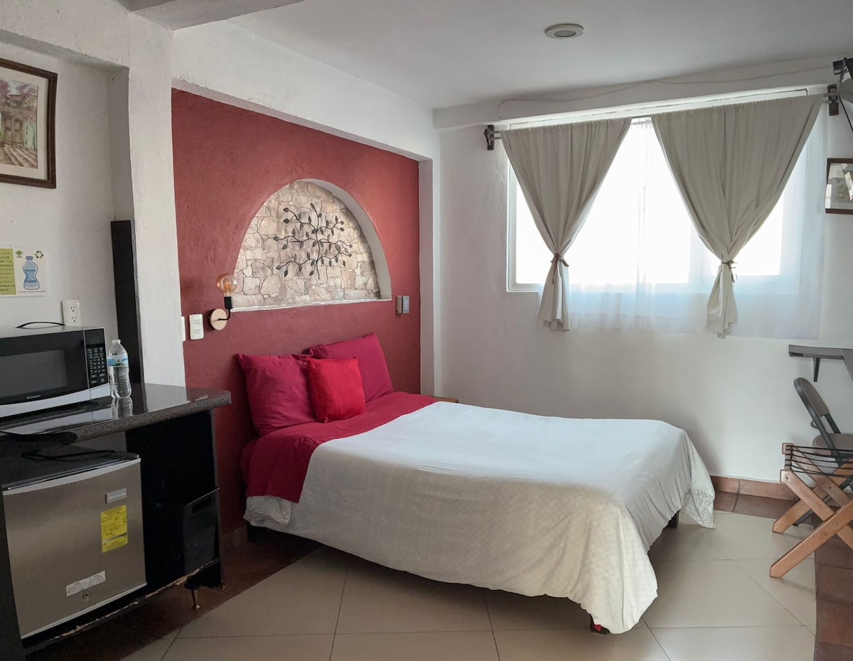 Este quarto privativo é ideal para descansar com conforto e tranquilidade. Tem uma cama de casal, banheiro completo, armário grande, frigobar e entrada independente. É um espaço funcional, aconchegante e bem iluminado. A localização é excelente: 15 minutos a pé do centro da cidade, 5 minutos de carro e 20 minutos a pé (ou 5 de carro) da estação de trem interurbano para CDMX. Embora a área seja ativa e viva, o quarto é tranquilo e perfeito para relaxar após um dia de atividades.