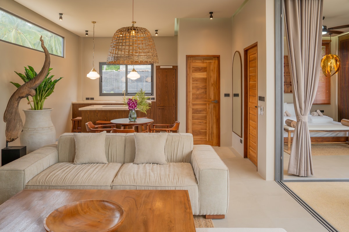 Vila elegante com piscina privativa em Koh Phangan Experimente a elegância tropical nesta nova vila de 2 quartos projetada para privacidade, conforto e relaxamento. Situado em um sereno bosque de coqueiros, este retiro moderno apresenta: ✨ Piscina privada com espreguiçadeiras 🛏️ 2 quartos espaçosos com camas king size Área 🛋️ de estar em plano aberto com um sofá confortável e TV inteligente Cozinha 🍽️ totalmente equipada com assentos de bar Terraço 🌿 para refeições ao ar livre 🌴 Rodeada por vegetação exuberante e cerca de bambu