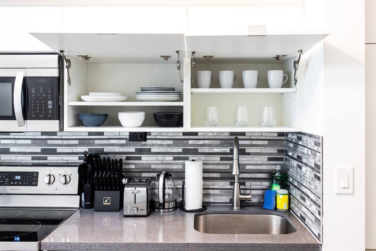 Casa de 2 quartos no piso principal, cheia de sol, com ESTACIONAMENTO; pode dormir até 4 pessoas. Com decoração moderna simples, camas queen size, janelas grandes e bonitas com cortinas de escurecimento do quarto, armazenamento no armário. Escrivaninhas de escritório nos quartos Cozinha completa, com óleo, temperos, torradeira, chaleira elétrica, cafeteira Keurig e café + chá de cortesia. Banheiro limpo com xampu+condicionador+gel de banho+loção SMART TV 60"Internet rápida Wi-Fi Check-in: 15H Check-out: 11H