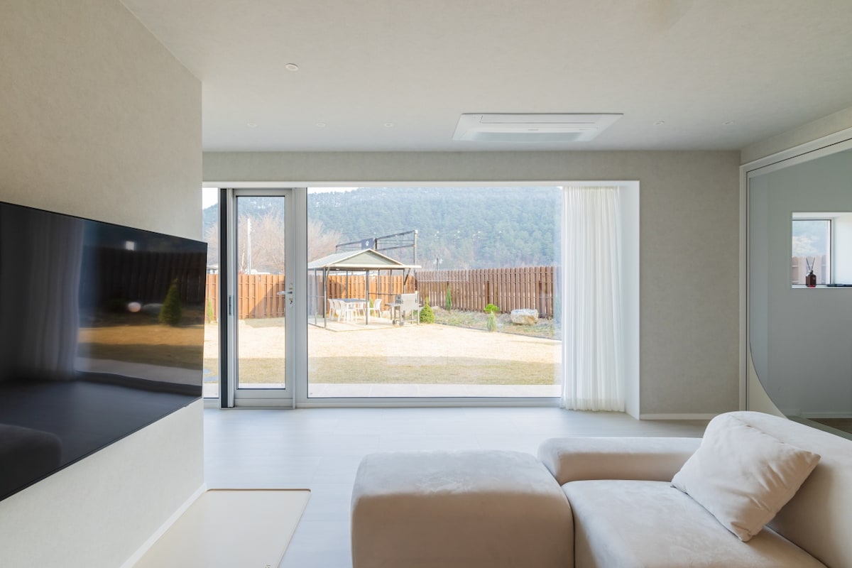 É uma acomodação privada não presencial para apenas uma equipe, confortável 25 pyeong em um grande terreno de 200 pyeong de carro da acomodação. É uma entrada da aldeia ao lado de uma estrada larga, mas fica a cerca de 50 metros da casa privada, por isso é uma acomodação privada não presencial que não perturba o olhar e o ruído circundantes. Os dois quartos têm uma cama queen size e duas camas de solteiro, por isso temos um espaço onde 4 pessoas podem descansar confortavelmente. Se houver pessoas adicionais, prepararemos roupa de cama na sala de estar. Você pode desfrutar dos filmes da Netflix em uma TV grande de 8k 85 polegadas. A distância da praia também fica a 3 minutos de carro da Praia de Surfe. Depois do estacionamento, há 20 escadas baixas e bonitas no jardim. Se você não se sentir à vontade, por favor, consulte-o durante a reserva.