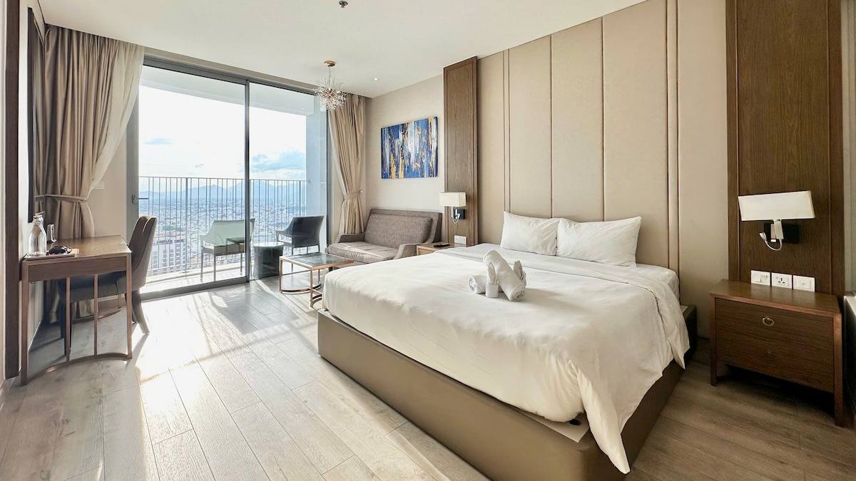 Este elegante estúdio em andar alto em Panorama Nha Trang oferece uma mistura perfeita de conforto e conveniência moderna. As janelas do chão ao teto emolduram vistas panorâmicas da cidade diretamente da sua cama king size com roupas de cama premium de 5 estrelas. O layout espaçoso inclui uma ampla mesa de trabalho, uma Smart TV de 43"e um banheiro grande e bem equipado. Se você está aqui a negócios ou lazer, você vai desfrutar de um retiro sereno no coração de Nha Trang, a poucos passos da praia, restaurantes e entretenimento.