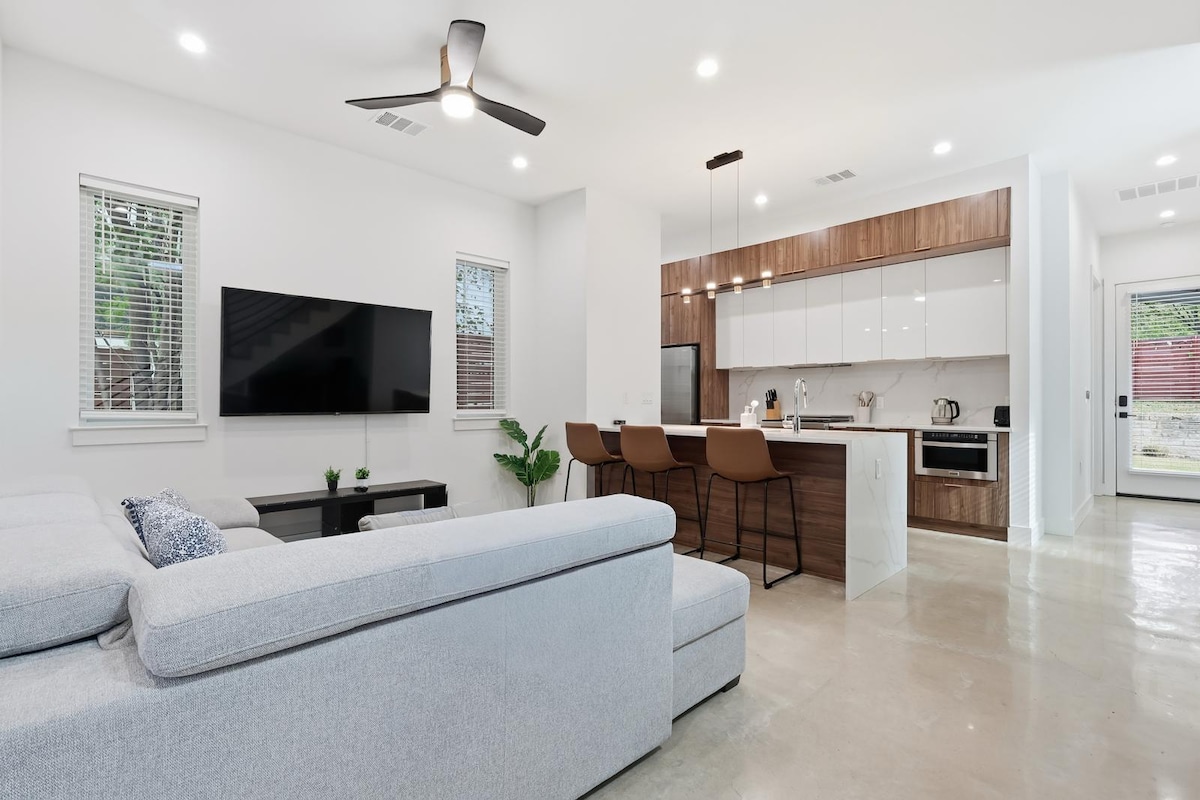 Bem-vindo ao Cerca Cove, sua espaçosa casa de luxo perto do Domínio. A poucos minutos de cervejarias locais, pickleball Bouldin Acres, estádio Q2, kartódromo K1 Speed, Top Golf e restaurantes, lojas e entretenimento fantásticos. Retire-se em grande estilo com móveis de qualidade da Crate & Barrel, West Elm, Article, Helix e arte de parede de artistas locais de Austin. Aconchegue-se na "grande sala" e desfrute do quintal amplo e recém-renovado. Este espaço é a base perfeita para explorar Austin no seu ritmo!