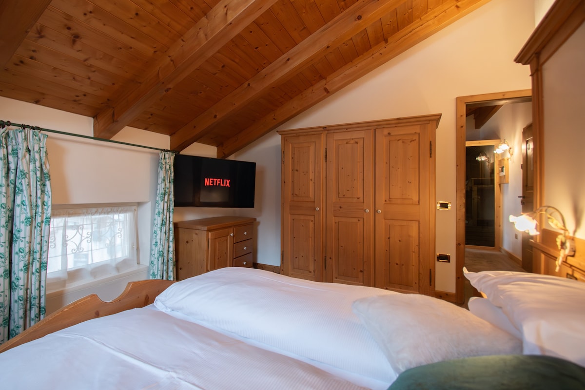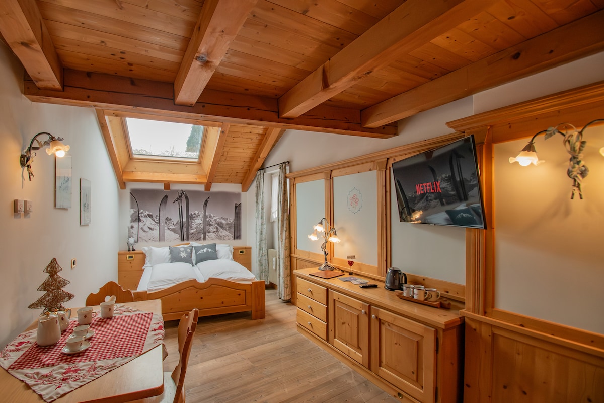 Quarto de cerca de 22 metros quadrados com cama de casal, varanda com vista panorâmica para as nossas montanhas ou para o vale. Piso de larício e móveis de abeto natural. Banheiro privativo com janela, chuveiro e secador de cabelo. Possibilidade de adicionar uma terceira cama (estadia permitida com no máximo 1 criança) Está equipado com cofre, frigobar, chaleira com seleção de chás e infusões, telefone, banheiro aberto com chuveiro, vaso sanitário separado e bidê. Incluso: café da manhã, lanche da tarde.