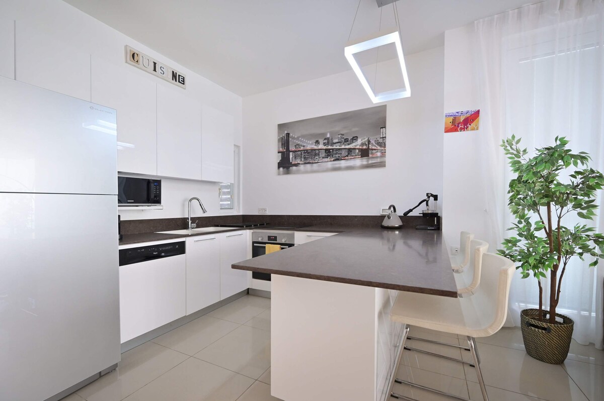Oferecemos vários apartamentos idênticos no prédio! Localizado em um novo projeto residencial, a poucos passos da praia e do famoso calçadão TLV. Saia do prédio para qual é a melhor localização de Israel! O apartamento tem vista para o mar de quase todas as janelas. Existem 2 quartos espaçosos, armários, chuveiro de pé, banheira de tamanho completo, sala de estar mimos com smart TV, cozinha totalmente equipada, máquina de lavar louça, Nespresso, área de jantar, AC, máquina de lavar roupa, secadora e muito mais! Estacionamento incluso!