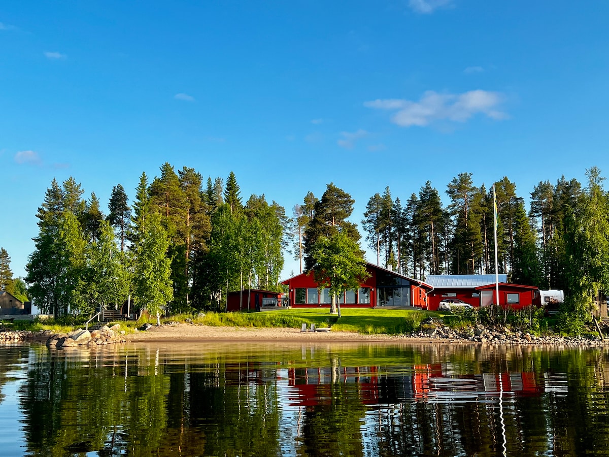 Easy access by bus: Wake up to a breathtaking view on a lake! Right by the water with a wonderful view on arctic nature's magic. 5 mins from Luleå by car, 15 min by bus. Parking by house. Classic Scandinavian interior with white birch walls and high spacious ceilings. Bedroom furnished like studio with kitchen. Piano. Fully tiled bathroom with a luxurious sauna. The perfect getaway: stay in bed all day, check out Luleå, or relax in nature. Ski/skate/bike/kayak rental. Wifi 500/500.