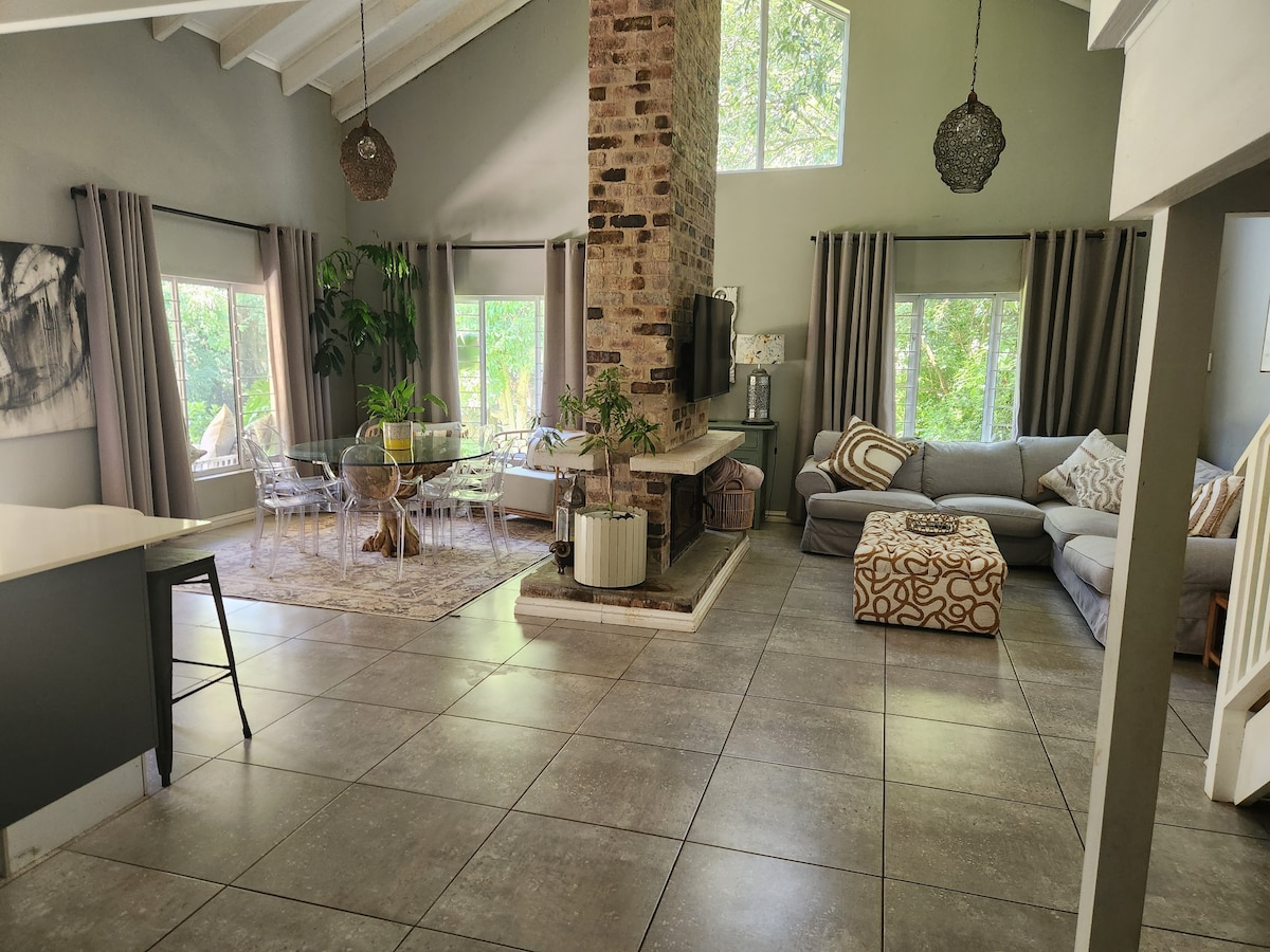 Desfrute do ambiente tranquilo da floresta, longe de tudo, mas perto de ótimos restaurantes, mercados, parques naturais e shoppings. Posicionado com segurança no beco sem saída com guardas 24 horas. 495m acima de Durban para ar mais fresco, propriedades antigas arborizadas e vida de pássaros maravilhosa. Aninhado no jardim, procure as famílias Kingfisher e Black Collared Barbet, com as canções noturnas de Coruja e Nightjar. Relaxe ou trabalhe um pouco em uma casa aconchegante e minúscula. Espaço de trabalho privado dedicado com excelente Wi-Fi.