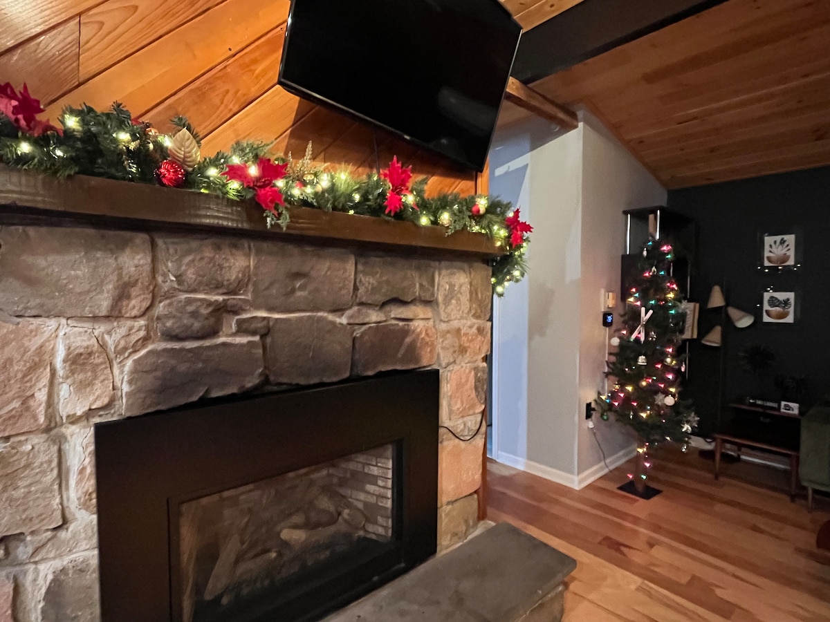 Escape to our charming 2BD log cabin, beautifully designed with modern, cozy touch. Enjoy the hot tub & outdoor TV & BBQ on the back deck. The spacious backyard offers room for games & relaxation. Inside-the open concept living area features a woodburning fireplace, dining room, kitchen & sunroom with a record player. The stunning bathroom includes a freestanding tub and shower. Both queen-sized bedrooms have closets for your convenience. Close to main Pocono Attractions -Jim Thorpe & Mountains