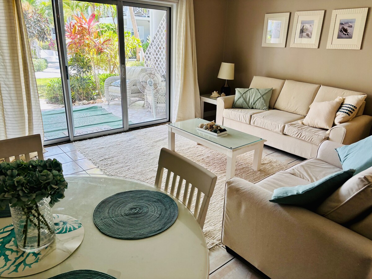 Relaxe em um estúdio espaçoso com portas francesas que se abrem para uma varanda de 310 pés quadrados cercada por árvores com acesso a uma piscina compartilhada. É um anexo à Windward House, mas tem uma sensação muito privada com sua própria entrada. Uma cama king size europeia e um sofá-cama que acomoda 2 pessoas, este é o espaço ideal para um casal em retiro ou com uma pequena família. Cozinha totalmente equipada com refeições internas e externas. A 5 minutos a pé da praia de Long Bay e a 10 minutos de carro da área de Grace Bay.